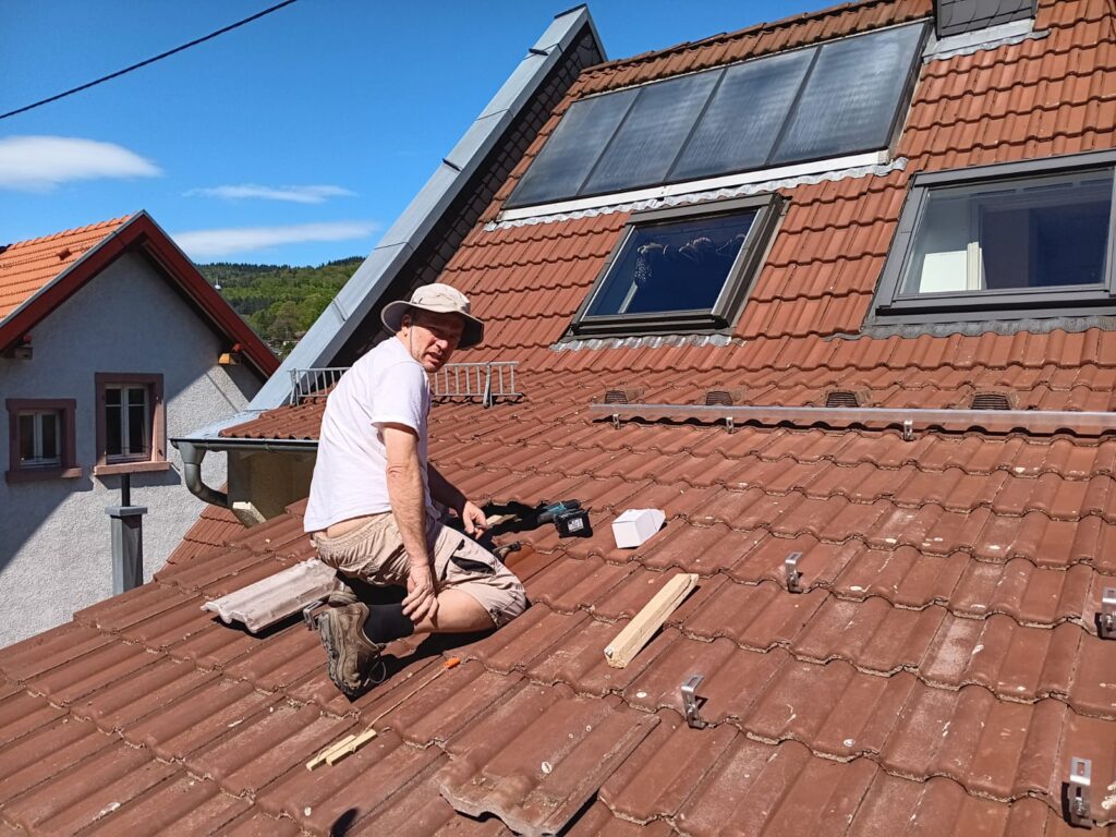 Der Dachdecker hat bestimmte Vorstellungen wie man das richtig macht und anstatt die nur 4 Jahre alten Dachziegel zu beschleifen, um Platz für die Dachhaken zu schaffen, hat er erstens die Creaton Lüfterziegel empfohlen und zweitens das von Creaton bevorzugte S:Flex Montagesystem statt das von mir geplannte K2 System bevorzugt. Die Lüfterziegel kosten etwa 40€ pro Dachhaken, man braucht etwa 2 pro Modul. Das heisst die Halterung ware teurer als das Modul. Aber ich habe Vertrauen gefasst und möchte auch, dass das einwandfrei wird, und habe mitgemacht. Es hat dann bis zum Sommer gebraucht bis schwarze Alustangen bestellt waren und ein kleines Zeitfenster sich bei den Dachdeckern öffnete.