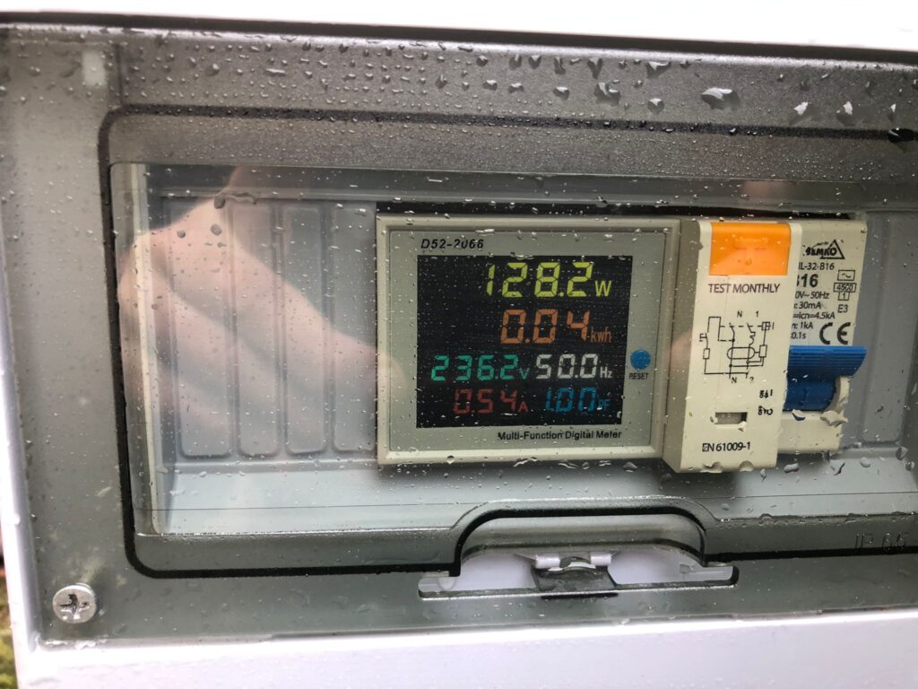 Der Stromanschluss konnte wie üblich mit einem Stecker in einem neben dem Anbau liegenden Stromanschlusskasten erfolgen. Daneben haben wir ein Messgerät platziert so dass jeder Bürger, der das Bürgerhaus besucht, sehen kann wie viel aktuell und wie viel in Summe schon an erneuerbarem Strom erzeugt wurde. Das erste Bild ist kurz nach dem Anschluss im Februar. Das zweite Mitte März.