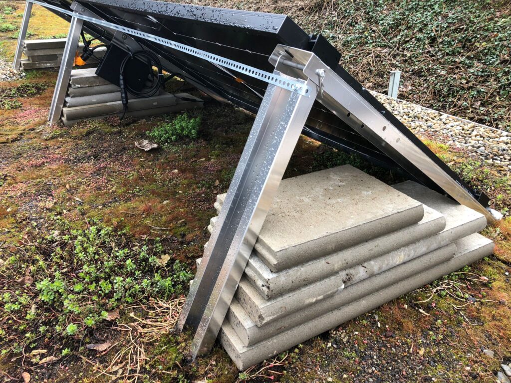 Die Halterungen wurden mit günstigen Rasenkantensteinen aus Beton beschwert die Klaus mit der Flex zurechtgeschnitten hatte. Das ganze kam auf den neuen Anbau und so musste kein einziges Loch durch eine Wand oder ein Dach gebohrt werden.