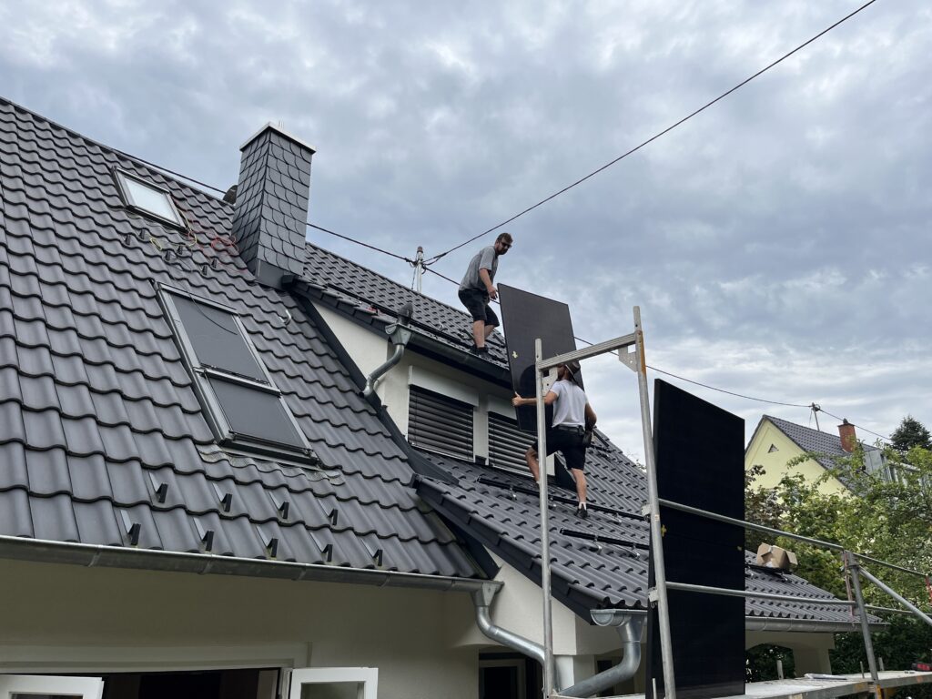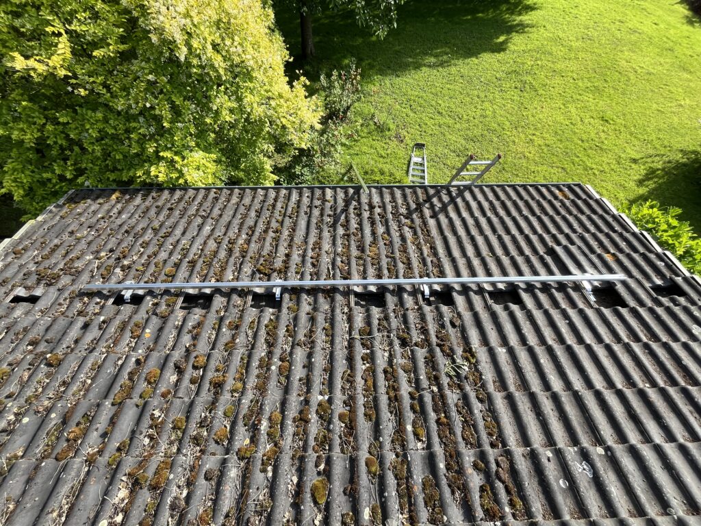 Die Nachbarin, einige Freunde, meine Frau und ich haben 8 Module an die Ostsee geschafft (gekauft bei Bauhaus) und innerhalb von ein paar Tagen montiert. Ich selbst hatte das ja schon mal bei meinem Freund und Nachbar Dirk mitgemacht. Was hier zur Verschärfung dazu kam war folgendes: