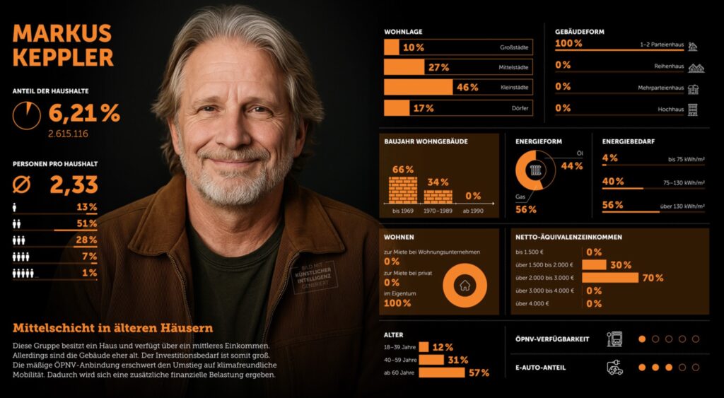 Als Beispiel habe ich mal eine Persona unten zitiert, die in einem älteren Haus wohnt, aber wahrscheinlich nicht in der Lage ist, sein Haus auf einen besseren Stand zu bringen. Nur wenn man alle diese Gruppen erreicht kann man von einem Erfolg der Energiewende sprechen.
